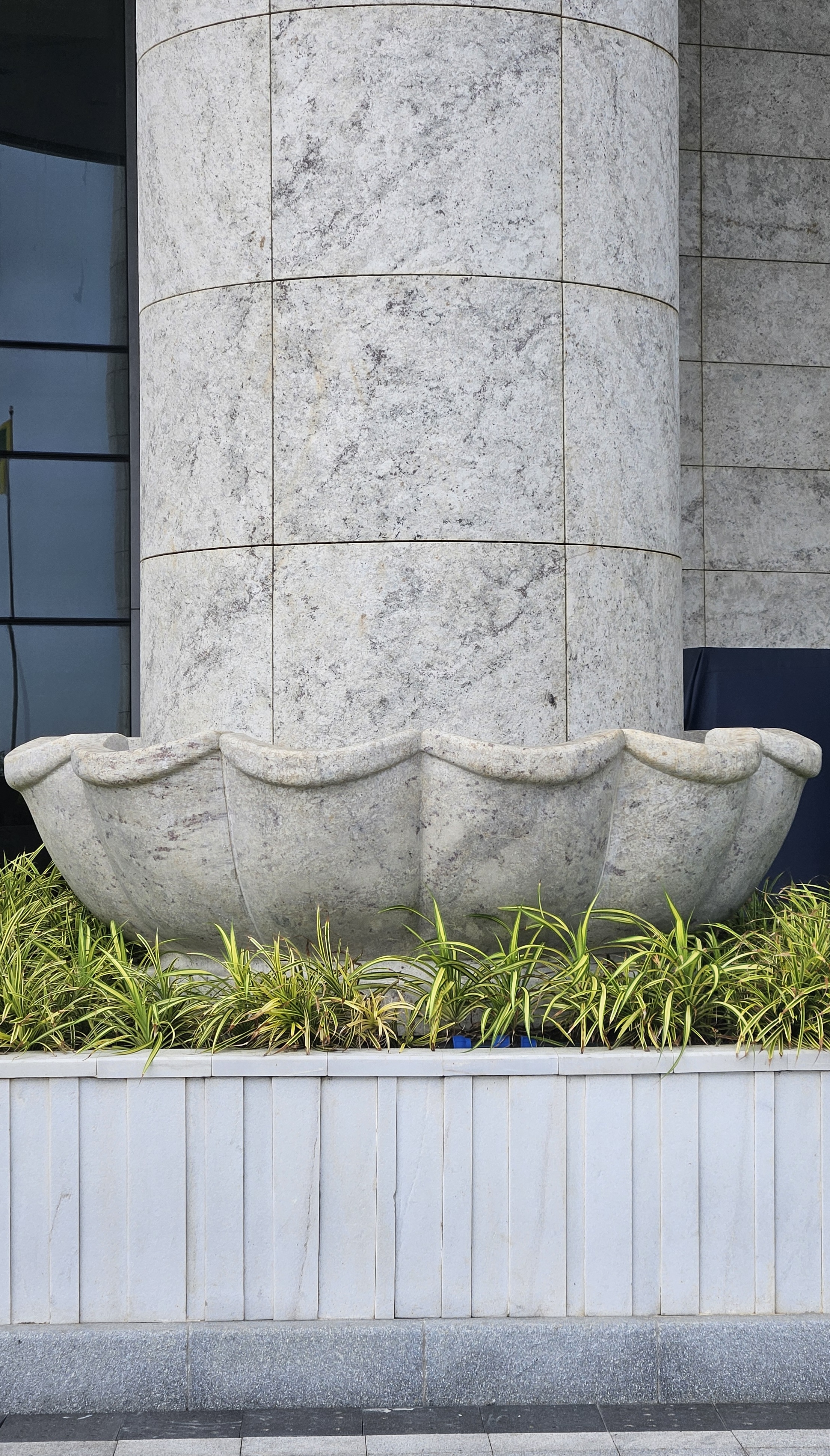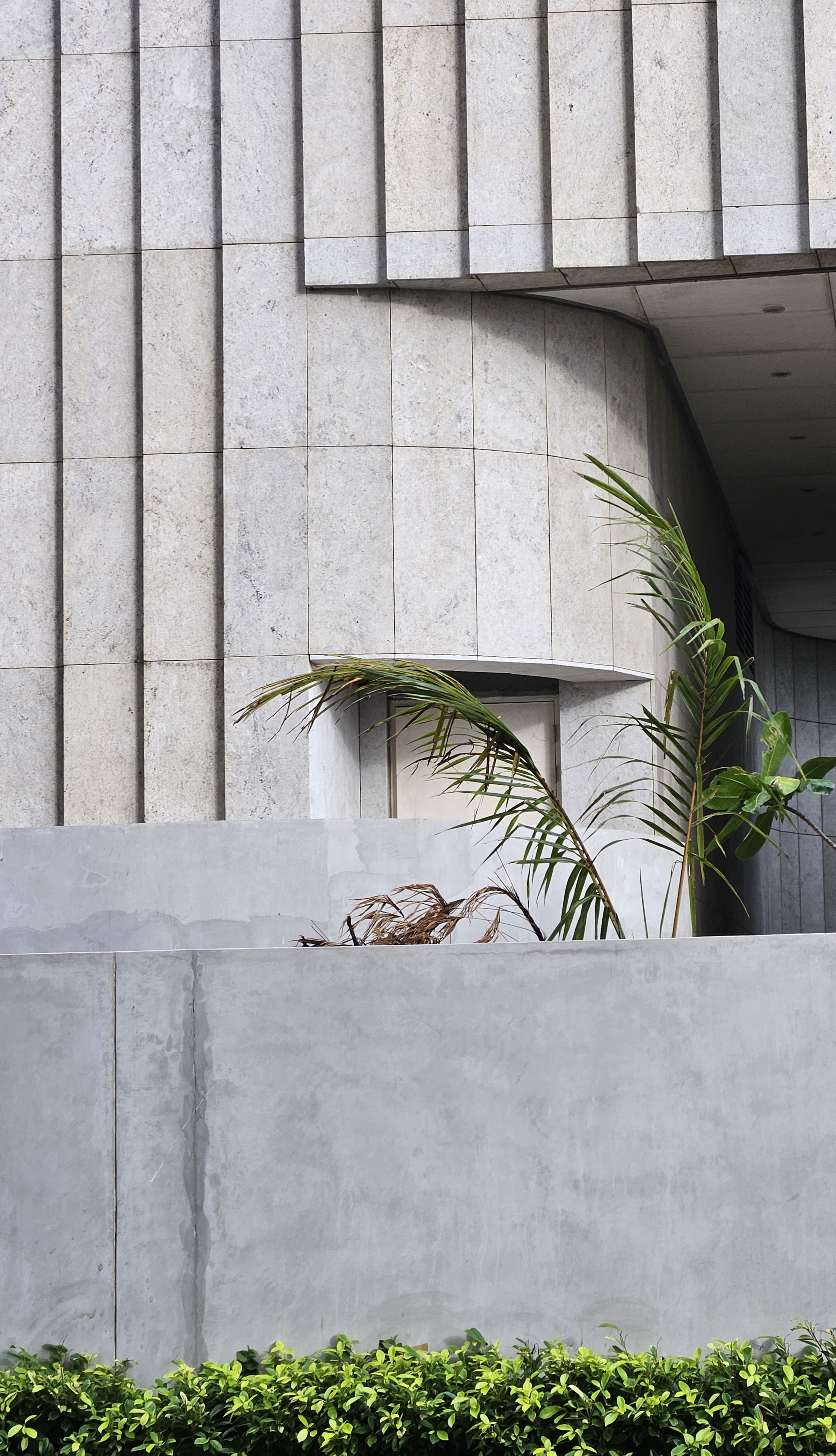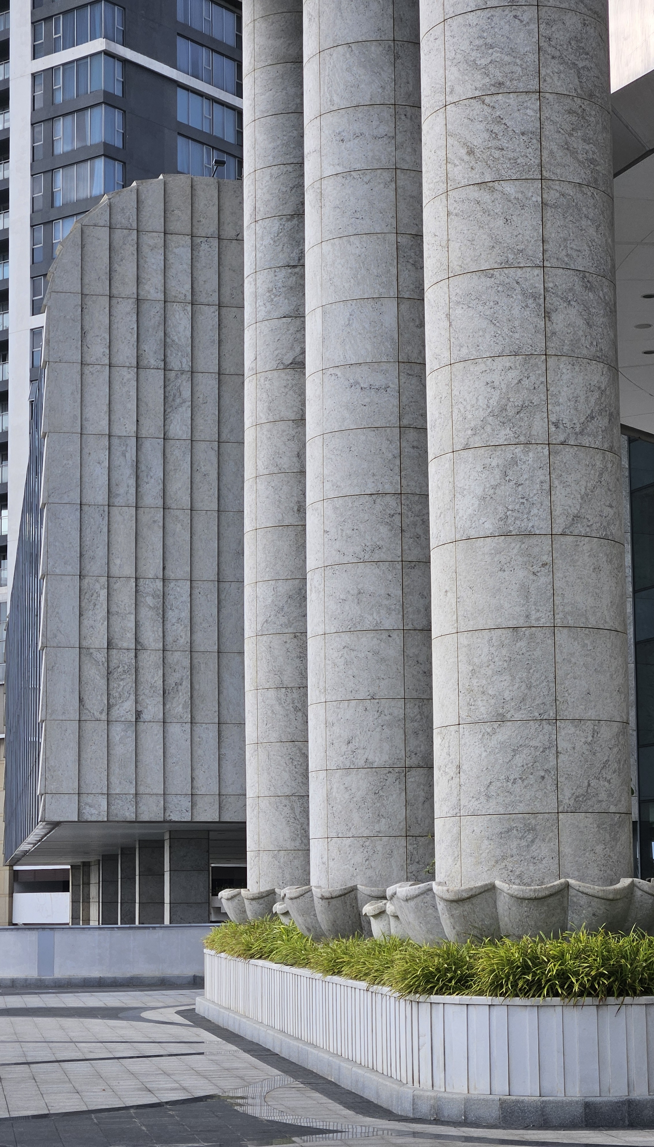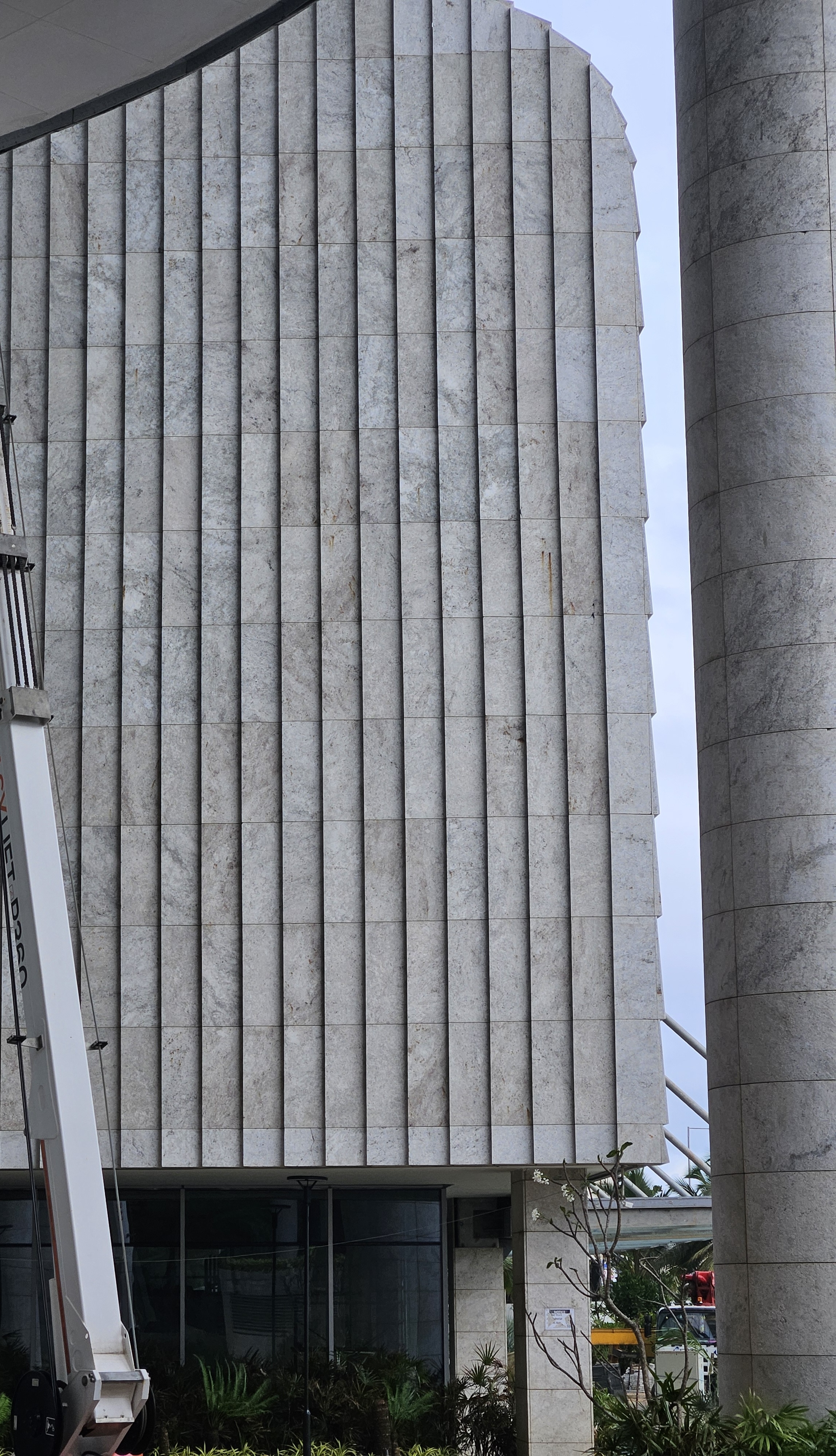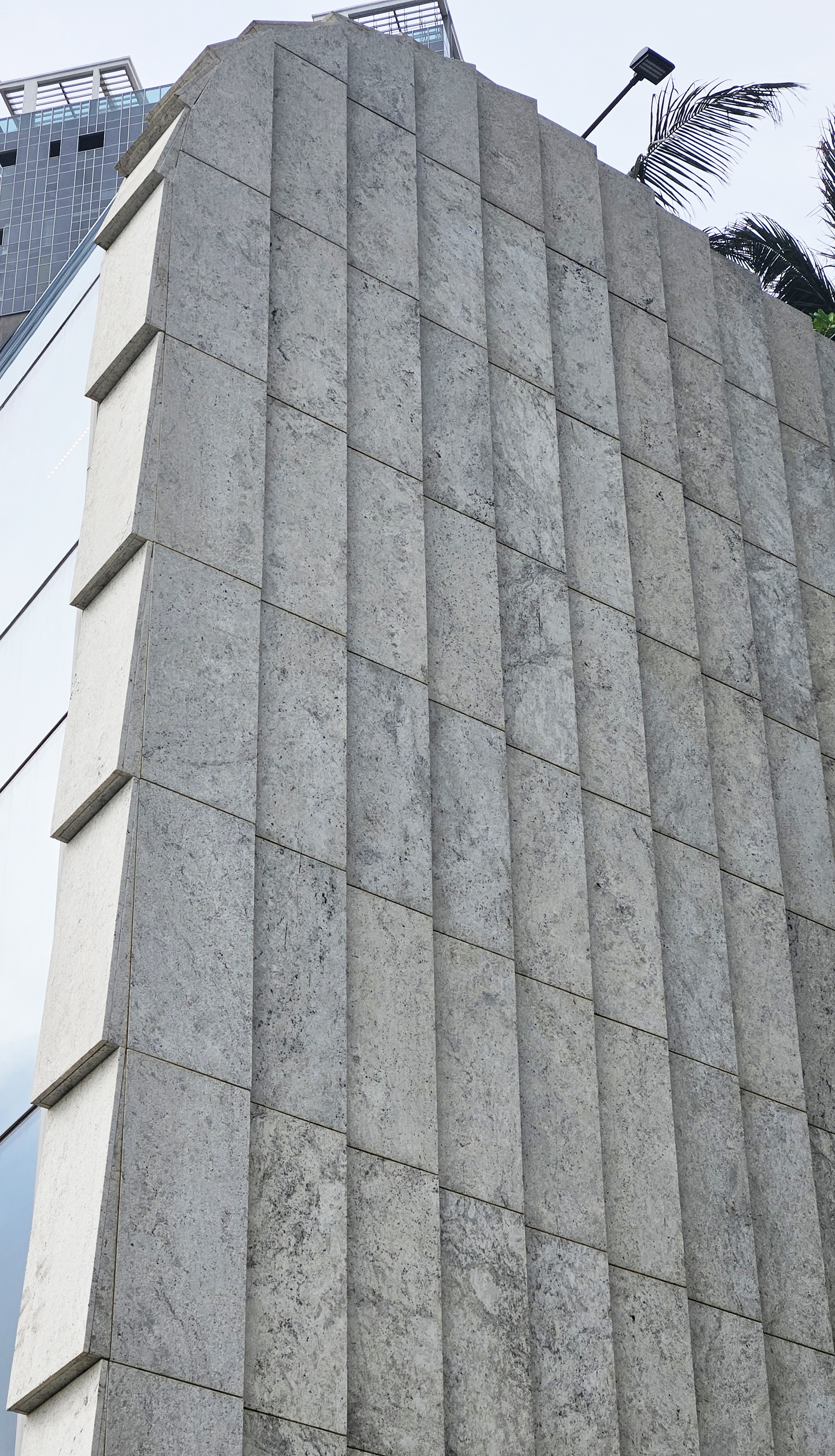 In addition to the hard landscaping and finishes of all the swimming pools and water bodies in various materials, 13000 sqm of ventilated façade cladding was done using 30 mm thick Colonial White granite from India. This includes circular segmented columns of up to 2.5 metre in diameter and 20 metre in height.