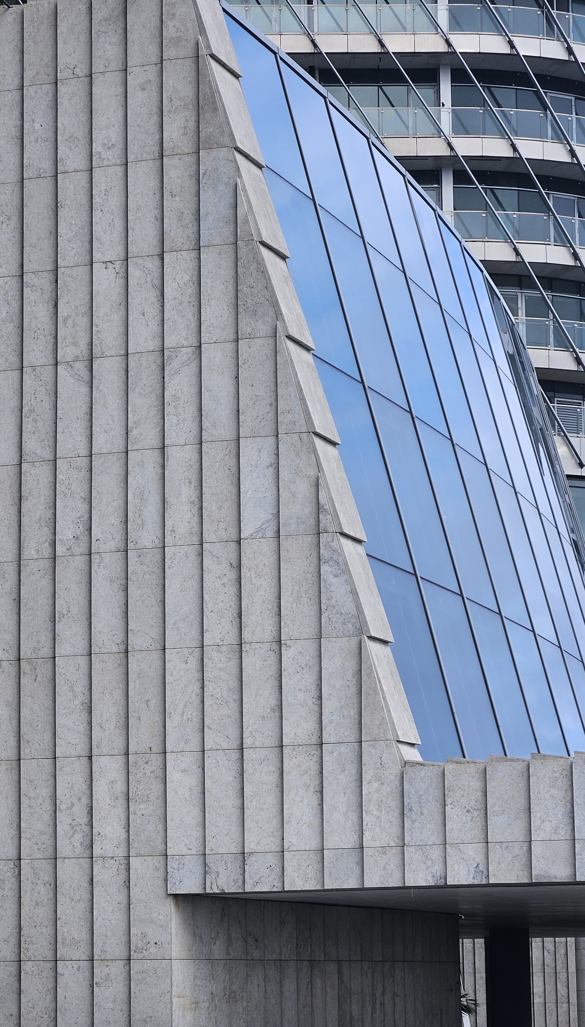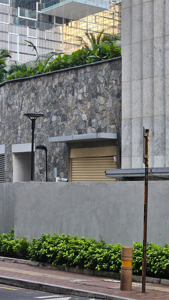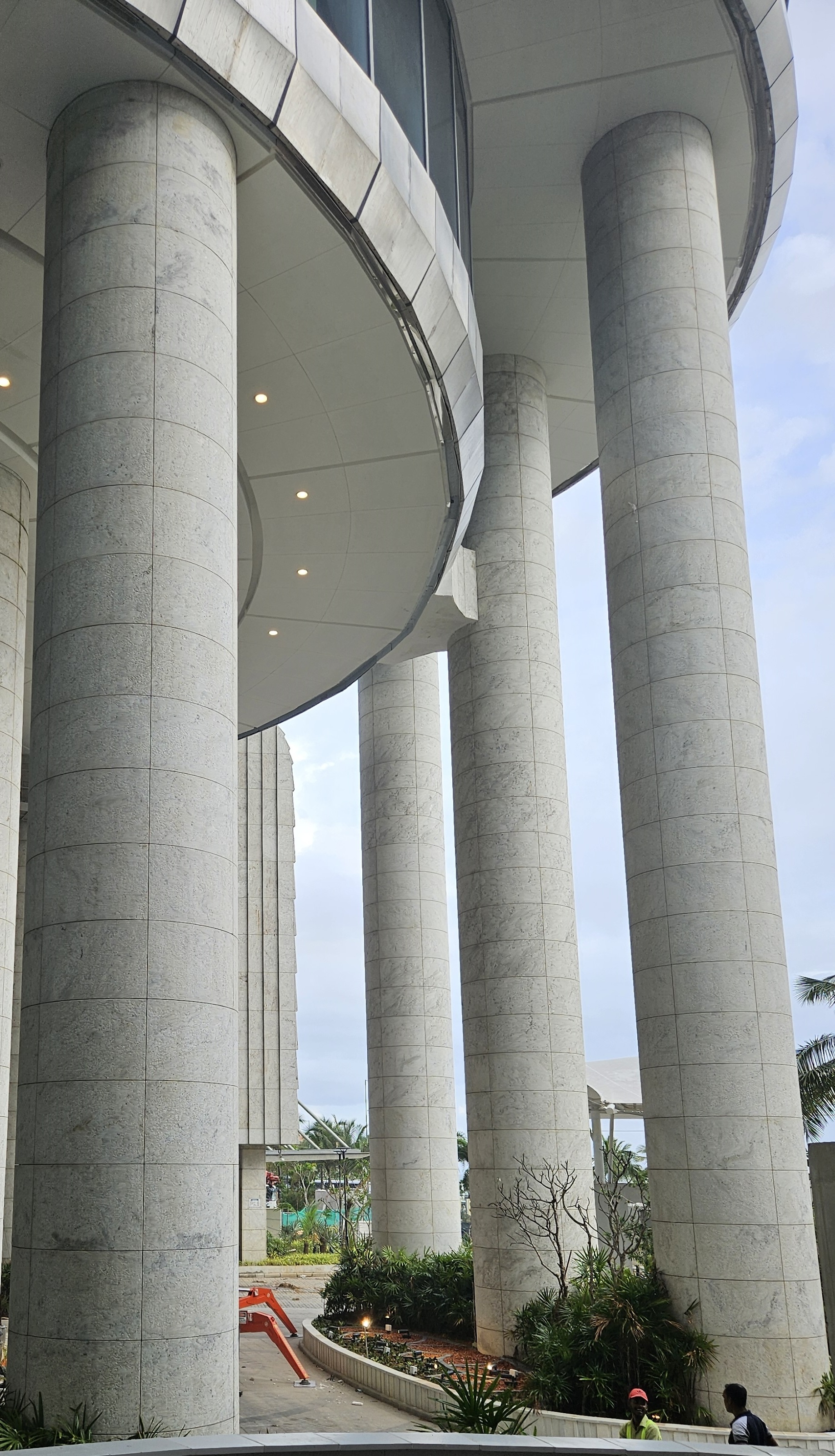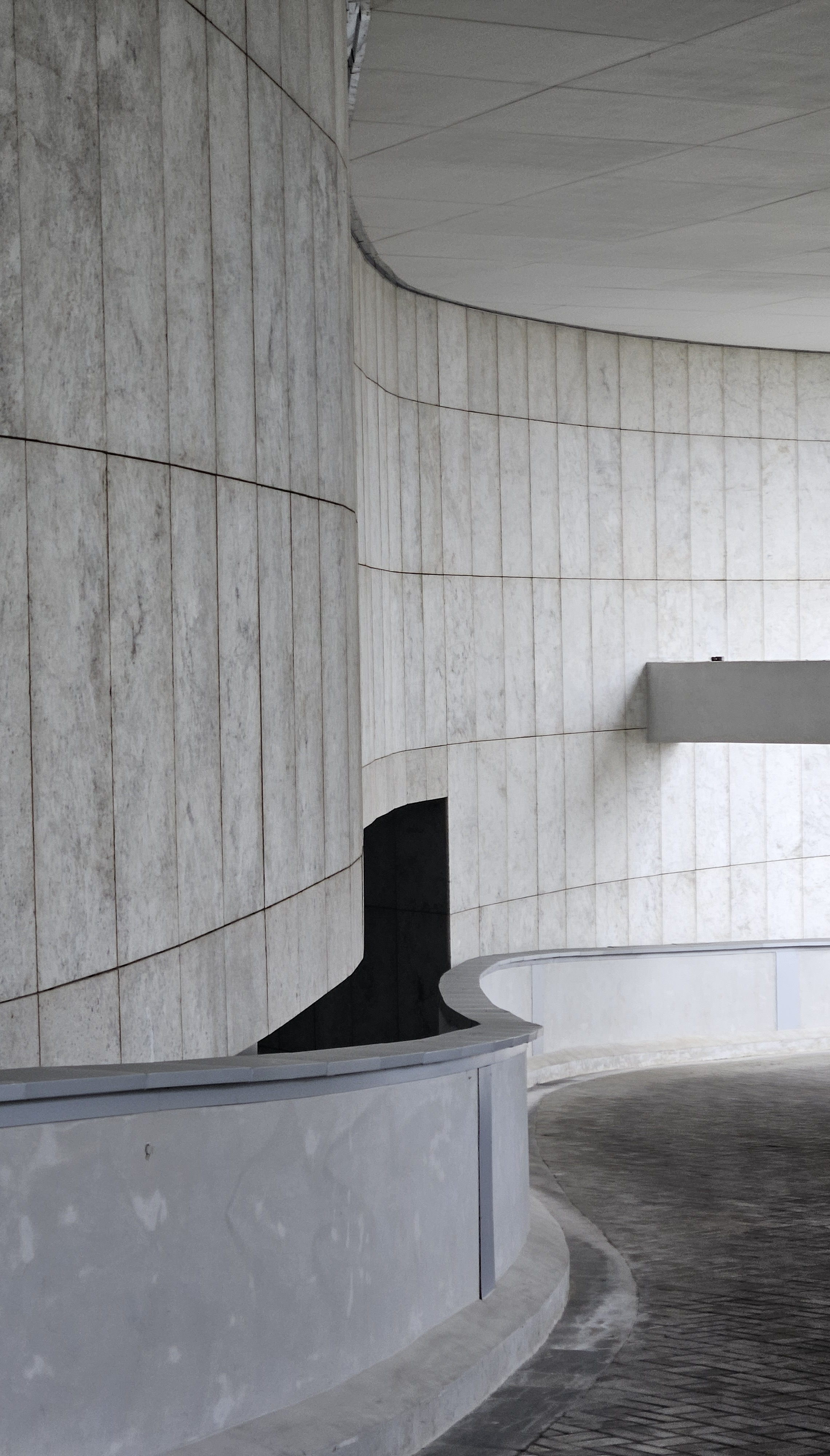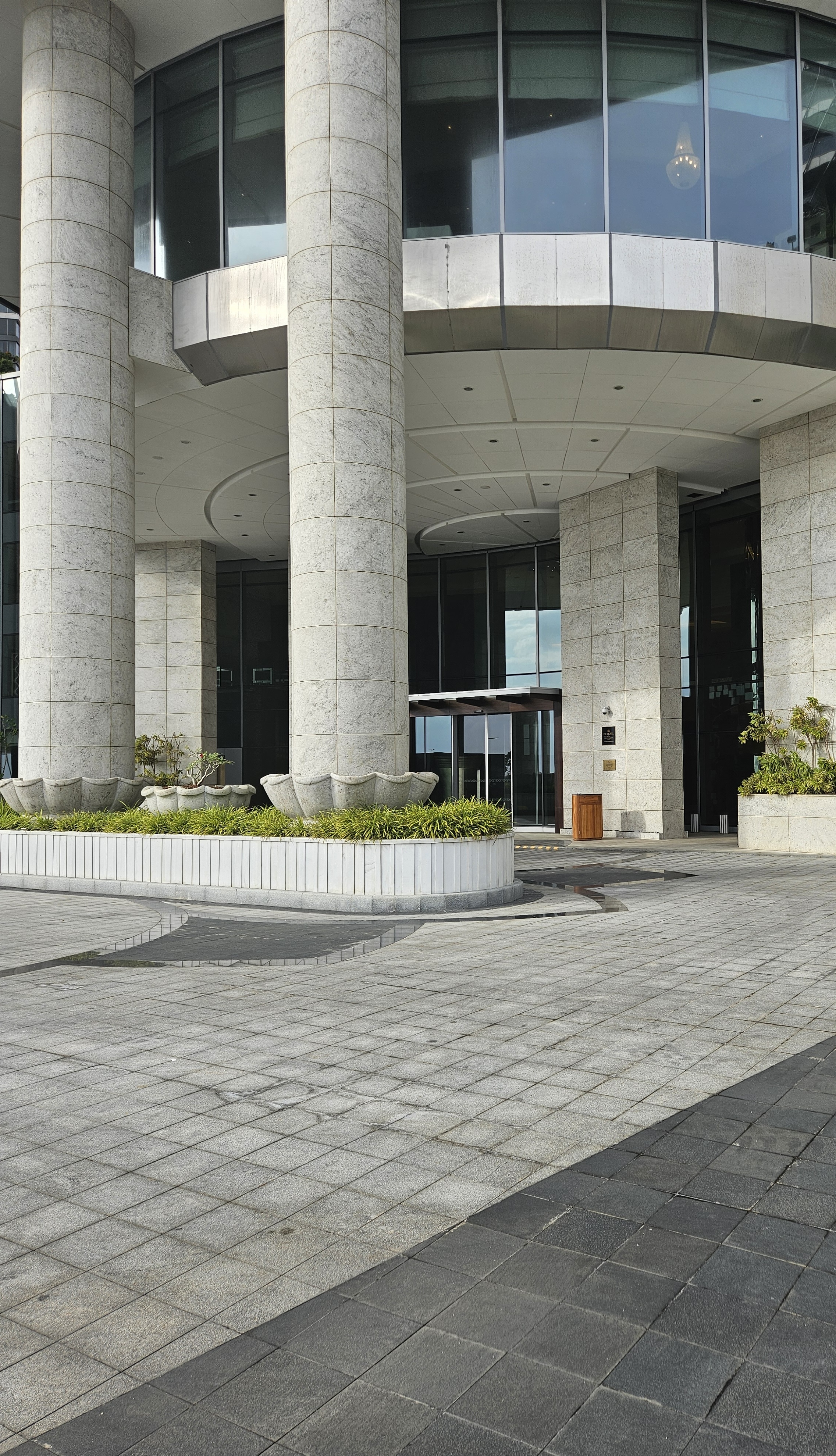In addition to the hard landscaping and finishes of all the swimming pools and water bodies in various materials, 13000 sqm of ventilated façade cladding was done using 30 mm thick Colonial White granite from India. This includes circular segmented columns of up to 2.5 metre in diameter and 20 metre in height.